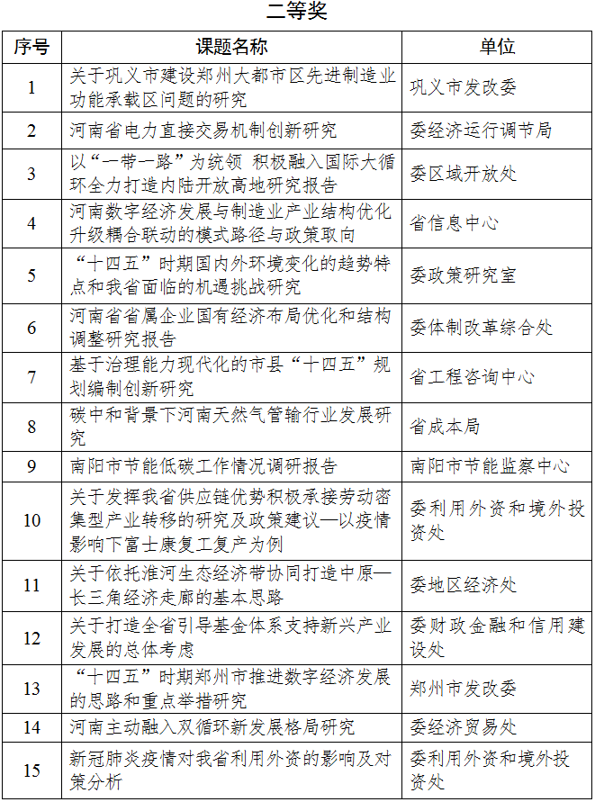 近日,委学术委员会对2020年度全省发展改革系统优秀研究成果进行了评选,共评出获奖成果57项,其中:一等奖10项、二等奖22项、三等奖25项,现予以公示。自公示之日起5个工作日内,如有异议,请向委学术委员会提出。
