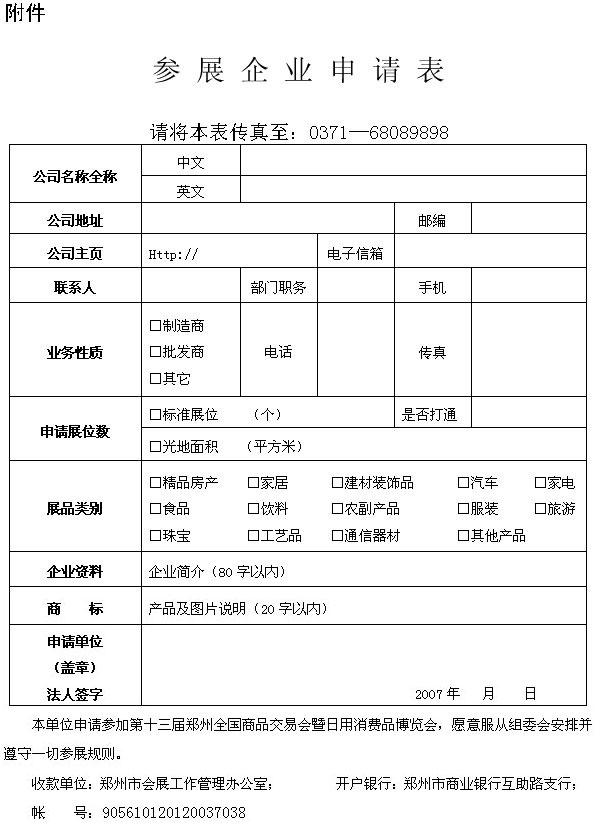附件:第十三届郑交会暨日用消费品博览会参展报名申请表