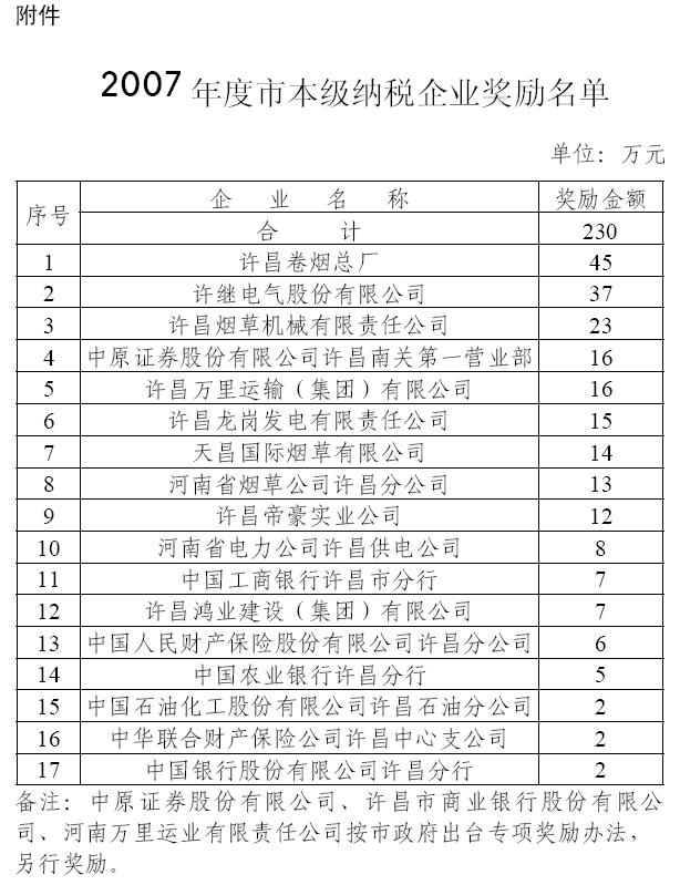 2007年,我市市本级广大企业不断加强内部管理,勇于改革创新,积极开拓市场,企业实力进一步壮大,纳税额逐年提高,保证了市本级财税收入的快速、稳定增长。为进一步调动企业加快发展的积极性,经企业申报、财政审核,市政府决定对2007年度为市本级财政做出突出贡献的许昌卷烟厂等17户市本级纳税企业进行奖励,奖励总金额230万元,其中30%部分用于奖励企业法人代表。