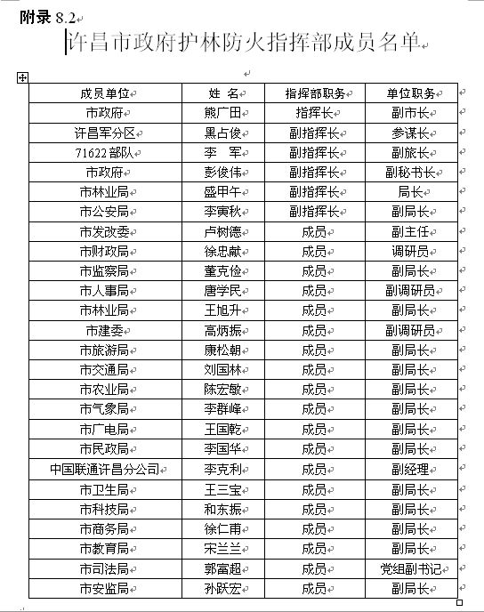 2.1 市政府护林防火指挥部及其办事机构的组成与职责。市政府成立以分管副市长为指挥长,许昌军分区、市政府办公室、市林业局、公安局主要负责同志为副指挥长,市发改委、财政局、人事局、建委、旅游局、交通局、农业局、气象局、广电局、联通公司、民政局、监察局、卫生局、科技局、商务局、教育局、司法局、安监局等部门负责同志为成员的市政府护林防火指挥部。市政府护林防火指挥部办公室设在市林业局。