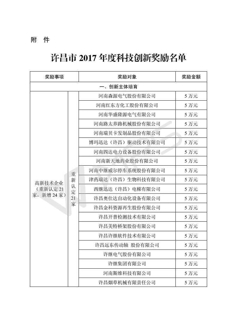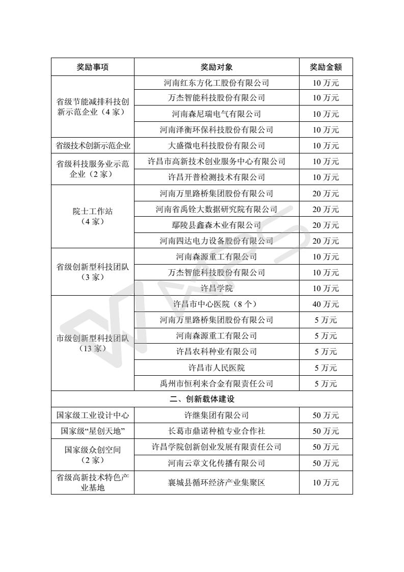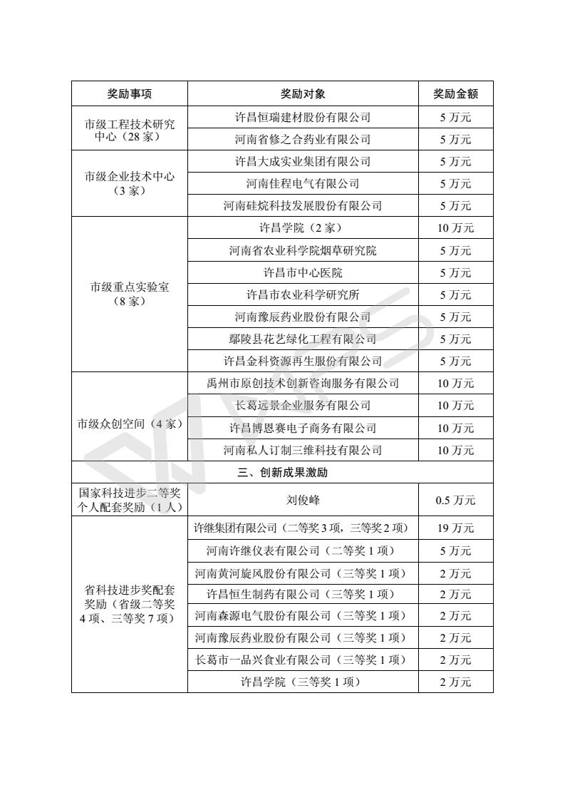 为贯彻落实党的十九大精神,大力实施创新驱动发展战略,根据《中共许昌市委许昌市人民政府关于落实国家和省创新驱动发展战略的实施意见》(许发〔2017〕17号)等文件规定,经市政府第28次常务会议研究,决定对2017年度为我市科技创新作出突出贡献的单位和人员给予奖励。其中,对在创新主体培育方面取得突出成绩的河南森源电气股份有限公司等单位奖励共计610万元;对在创新载体建设方面取得突出成绩的许继集团有限公司等单位奖励共计1015万元;对在创新成果方面取得突出成绩的刘俊峰等单位和个人奖励共计36.5万元;对在知识产权方面取得突出成绩的西继迅达(许昌)电梯有限公司等单位和个人奖励共计329.6万元;对承担省级重大科技专项的河南豪丰机械制造有限公司等单位奖励共计60万元。