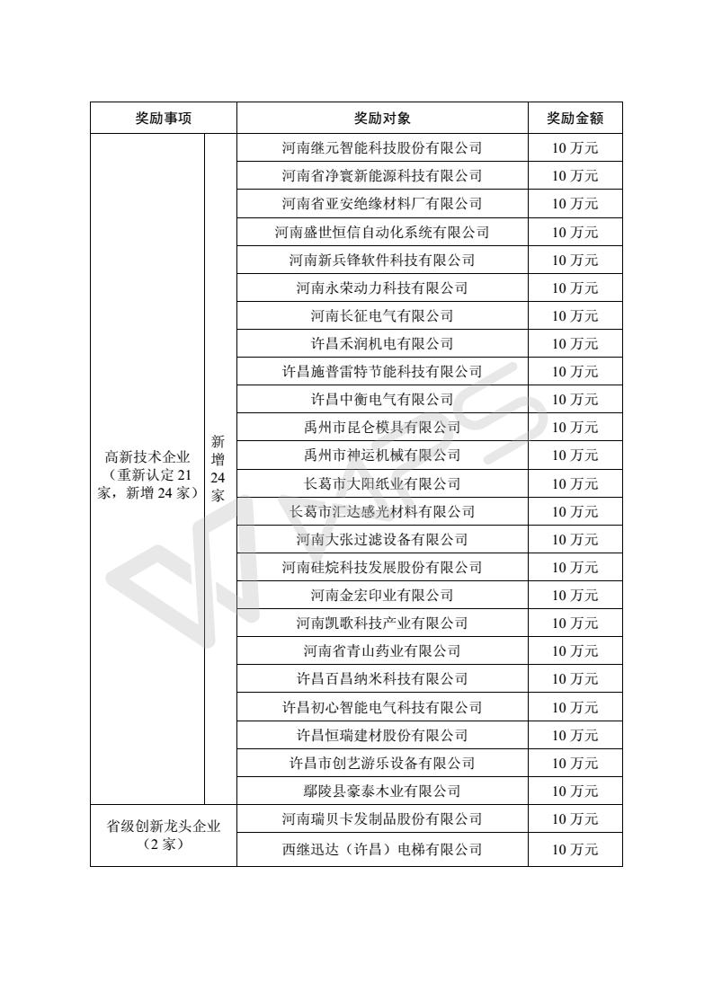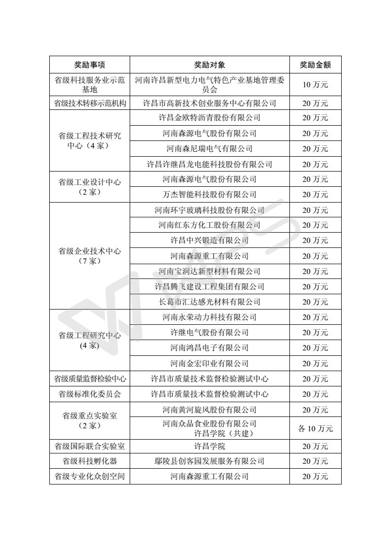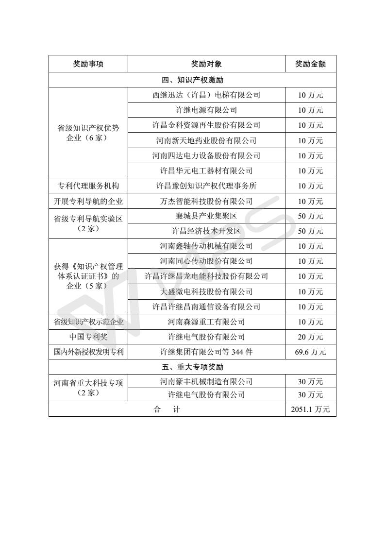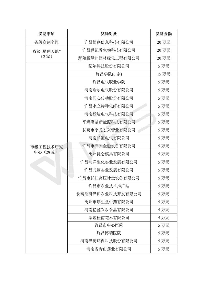 为贯彻落实党的十九大精神,大力实施创新驱动发展战略,根据《中共许昌市委许昌市人民政府关于落实国家和省创新驱动发展战略的实施意见》(许发〔2017〕17号)等文件规定,经市政府第28次常务会议研究,决定对2017年度为我市科技创新作出突出贡献的单位和人员给予奖励。其中,对在创新主体培育方面取得突出成绩的河南森源电气股份有限公司等单位奖励共计610万元;对在创新载体建设方面取得突出成绩的许继集团有限公司等单位奖励共计1015万元;对在创新成果方面取得突出成绩的刘俊峰等单位和个人奖励共计36.5万元;对在知识产权方面取得突出成绩的西继迅达(许昌)电梯有限公司等单位和个人奖励共计329.6万元;对承担省级重大科技专项的河南豪丰机械制造有限公司等单位奖励共计60万元。