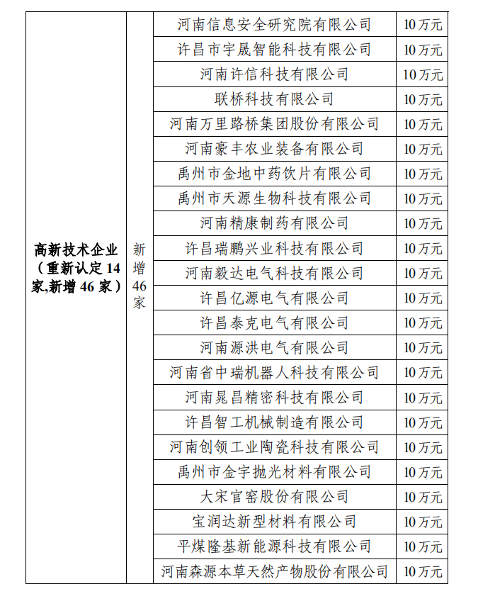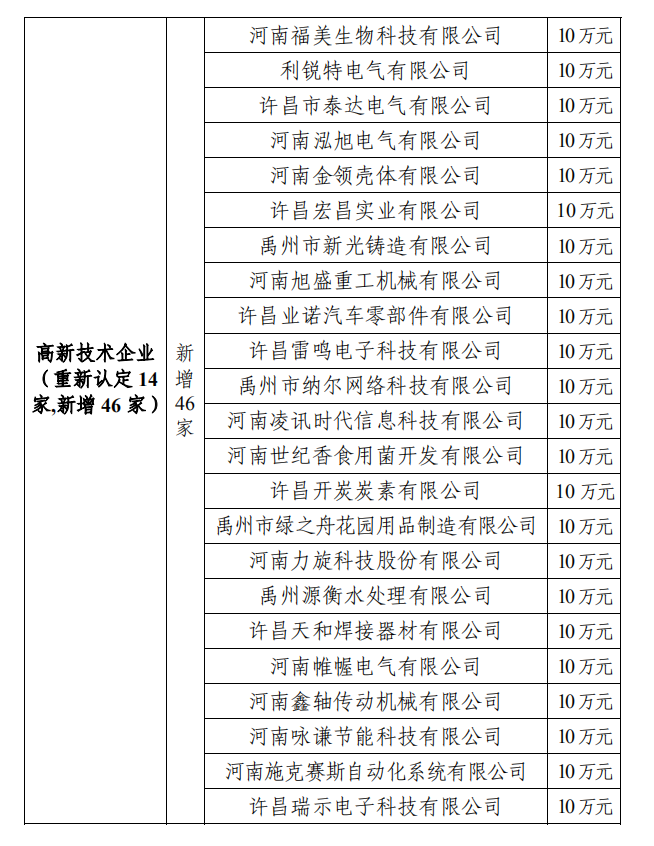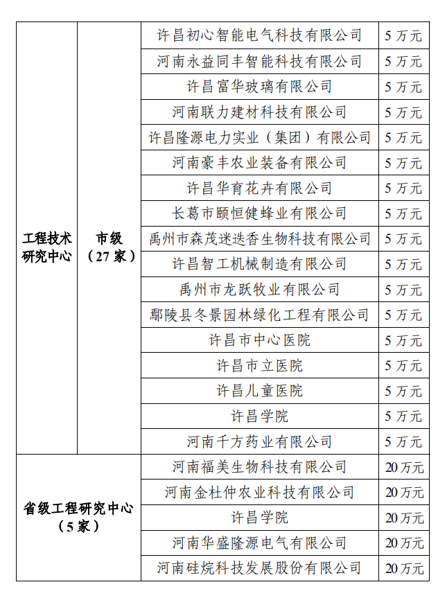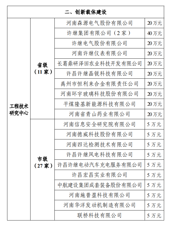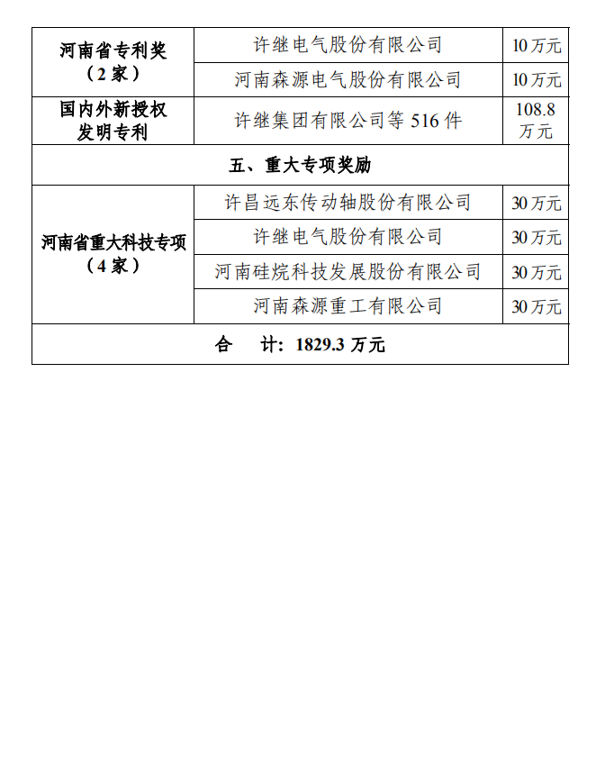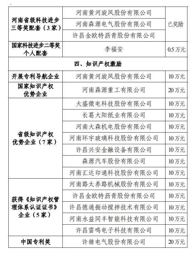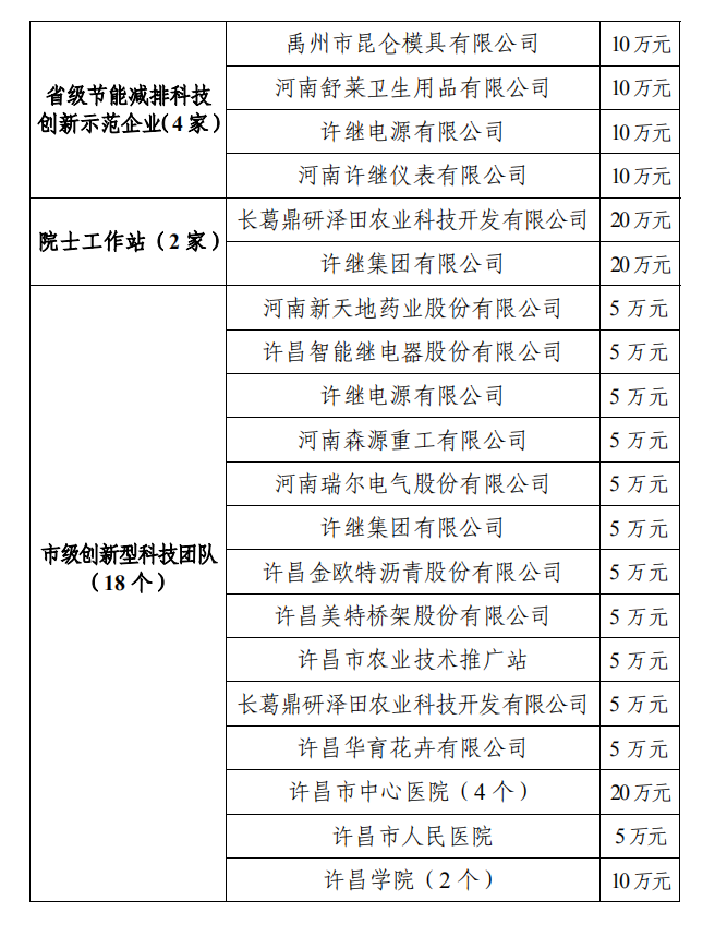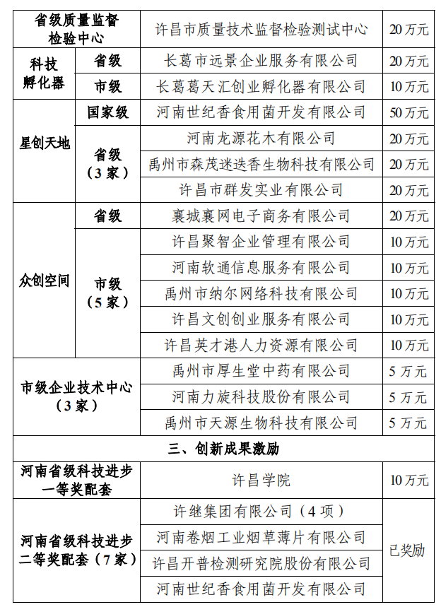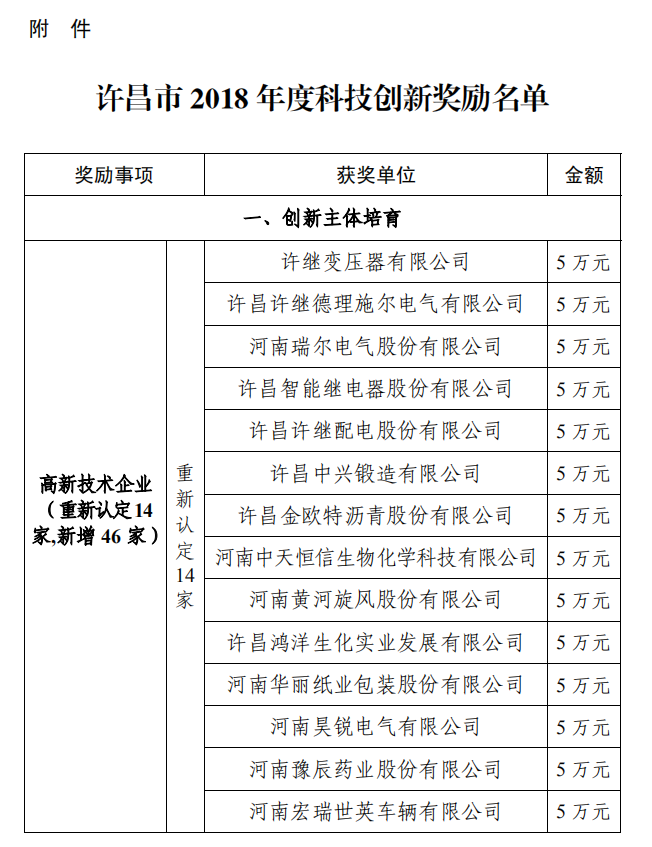 为深入贯彻习近平新时代中国特色社会主义思想和党的十九大精神,大力实施创新驱动发展战略,根据《中共许昌市委许昌市人民政府关于落实国家和省创新驱动发展战略的实施意见》(许发〔2017〕17号)等文件规定,经市政府第55次常务会议研究,决定对2018年度为我市科技创新作出突出贡献的单位和人员给予奖励。其中,对在创新主体培育方面取得突出成绩的许继变压器有限公司等66家单位和18个市级创新型科技团队奖励700万元;对在创新载体建设方面取得突出成绩的河南森源电气股份有限公司等59家单位奖励700万元;对在创新成果方面取得突出成绩的许昌学院等单位和个人奖励10.5万元;对在知识产权方面取得突出成绩的河南黄河旋风股份有限公司等17家单位和516件国内外新授权发明专利奖励298.8万元;对承担省级重大科技专项的许昌远东传动轴股份有限公司等4家单位奖励120万元。