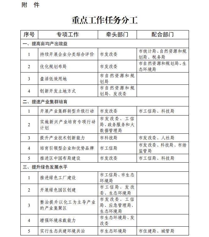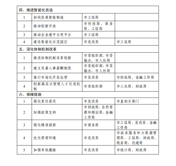 (一)强化责任落实。各产业集聚区要根据本方案确定的重点任务,结合各自实际,细化年度目标任务和具体推进措施,加强对区内企业和项目的点对点服务,统筹做好招商引资、配套服务、资本运营、运行调度等重点工作。市直各相关部门要按职责分工做好服务保障,提高土地保障、环保、审批审核等工作效率,确保服务质量。