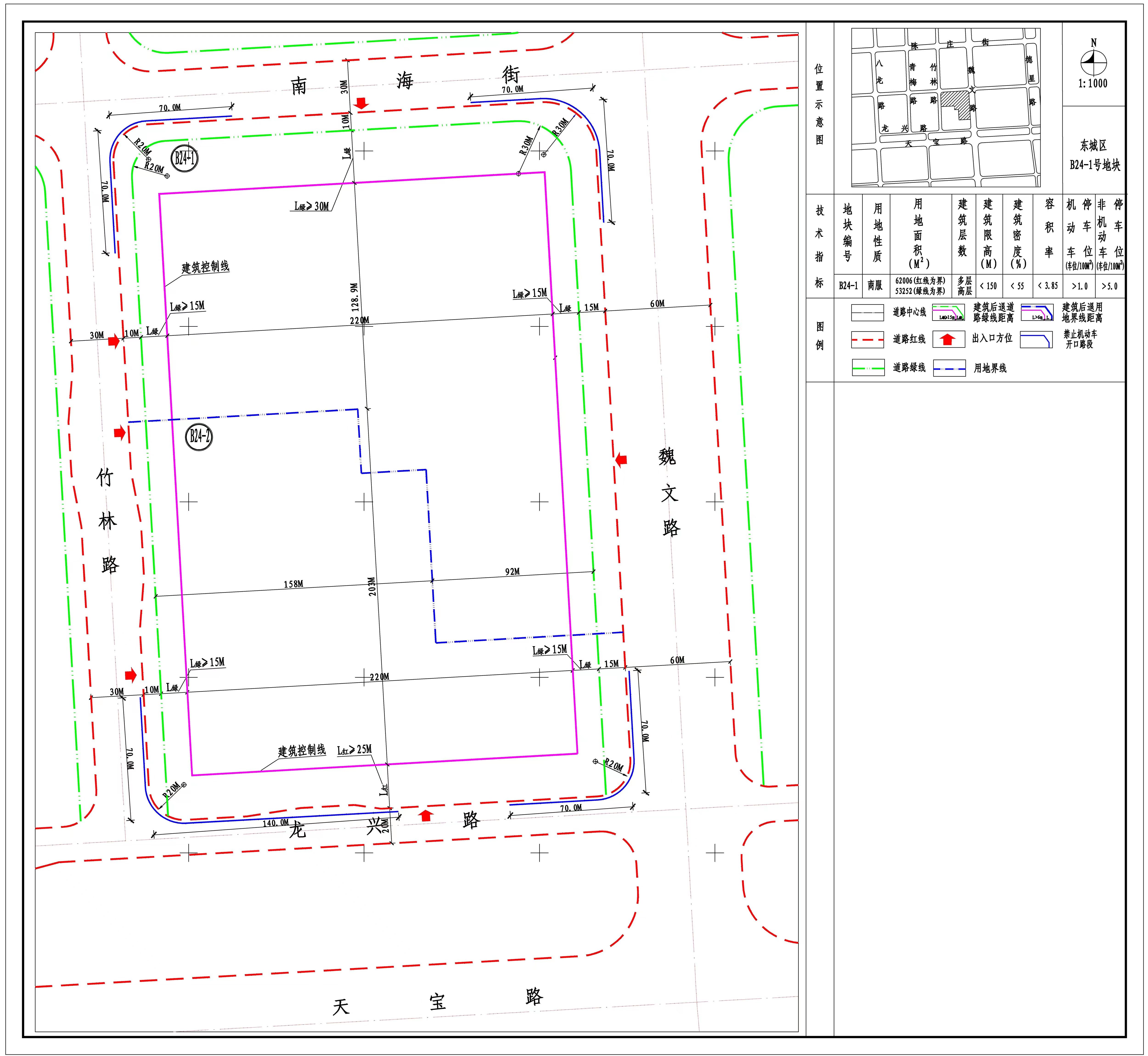 该项目位于竹林路以东、魏文路以西、南海街以南、龙兴路以北。规划红线内总用地面积62006平方米(93.0亩),规划绿线内总用地面积53252平方米(79.9亩),用地性质为商服用地。建筑层数多层高层,建筑限高<150米,建筑密度≤55%,容积率<3.85,机动车停车位>1.0车位/100㎡,非机动车停车位>5.0车位/100㎡。