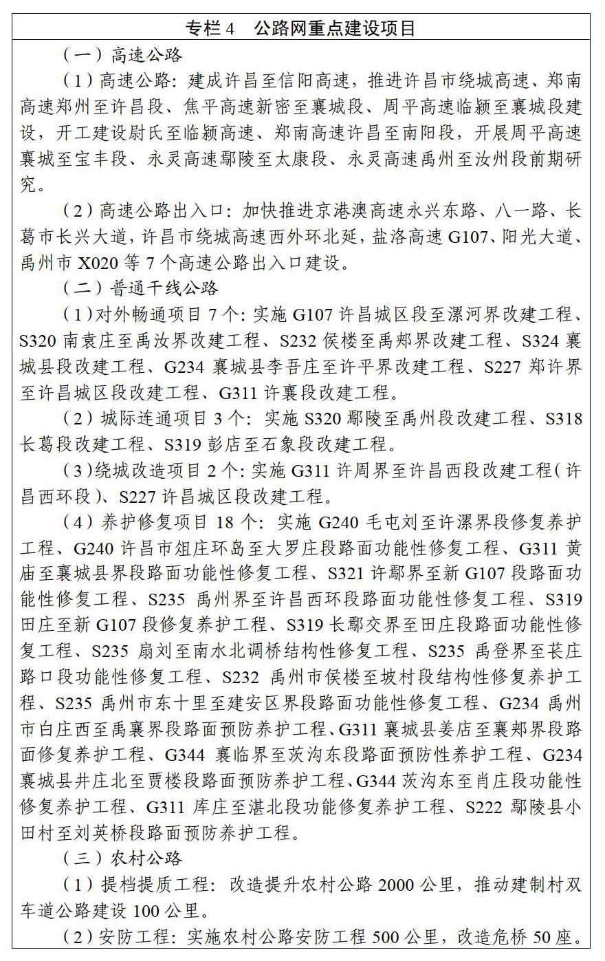 ——高速公路方面:开工建设许昌至信阳高速公路,对构建京港澳高速西复线、减缓通道交通压力具有重大意义。到“十三五”末,高速公路总里程达到281公里,初步形成“米”字形高速公路网,实现各县(市、区)10分钟上高速。