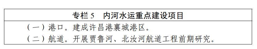 扎实推进内河水运建设。加快建成许昌港襄城港区,打造地 区性重要港口,推动大宗货物“公转水”。开展贾鲁河、北汝河 航道工程前期研究,充分发挥干支联动、水系联通效应。
