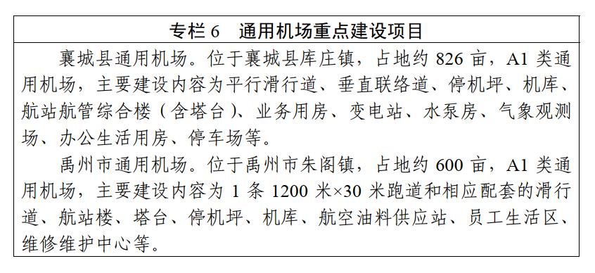 加快通用机场建设。积极构建功能完备的通用机场体系,加快 推进襄城县、禹州市通用机场前期工作,有序推动项目开工建设, 拓展通用机场在城市配送、物流运输、应急救援、公共服务、农林 作业、试飞作业等方面功能,依托通用机场带动临空产业发展。