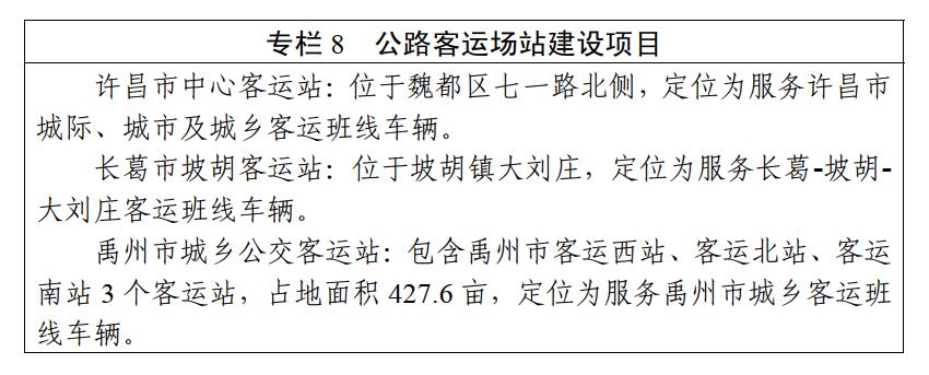 完善公路客运场站覆盖。改造提升许昌市中心客运站,进一步完善客运枢纽功能。建成长葛市坡胡客运站,服务城乡客运班线,实现城乡道路客运资源共享;加快建成禹州市城乡公交客运站,全面提升城乡公交基础设施配套水平。