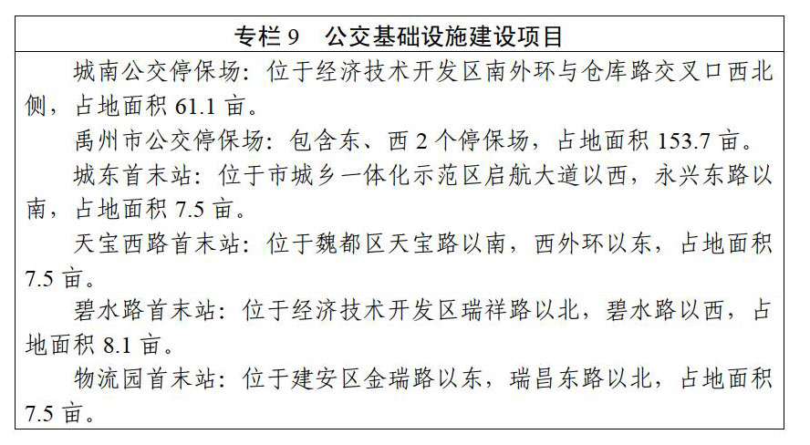 推进公交基础设施建设。整合公交场站功能,新建城南、禹州市公交停保场和城东、天宝西路、碧水路、物流园公交首末站,提高公交运营效率,改善公交换乘条件。