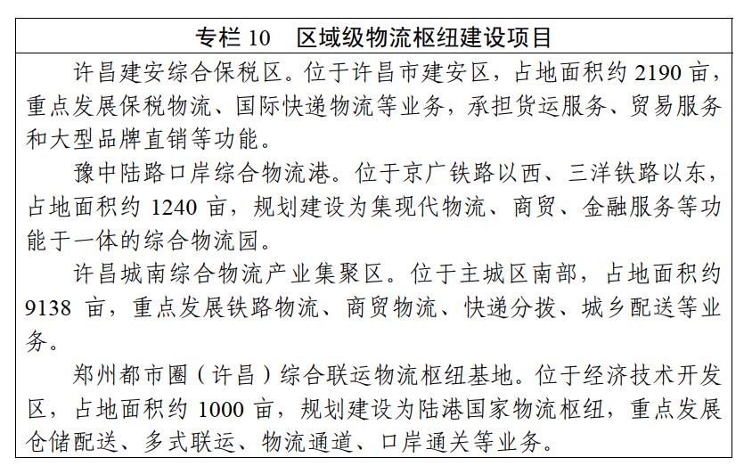 内陆口岸枢纽经济区。依托许昌保税物流中心、中国(许昌)跨境电子商务综合试验区、豫中陆路口岸综合物流港,大力发展口岸经济、保税经济,完善保税仓储、流通加工、国际分拨与配送等功能,发展战略新兴、跨境电商、国内国际贸易等增值性服务,助推加工贸易转型升级,畅通国际要素流动。推动郑许海关互认、口岸功能共享,共建特色跨境电商基地,打造对外开放新高地。