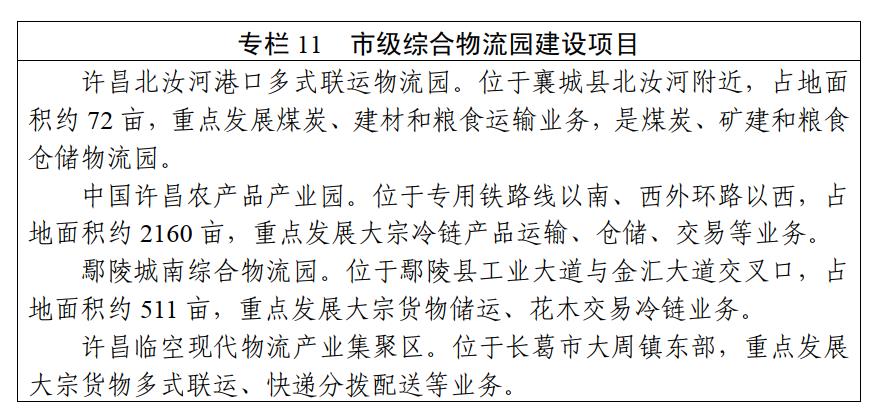 加快物流组织体系建设。以铁路物流、商贸物流、快递分拨和多式联运为重点,加快推进许昌城南综合物流产业集聚区等项目建设,打造全面覆盖的综合配送服务网络。巩固提升冷链、大宗货物等特色物流,培育壮大国际物流、区域物流、城乡物流,推进物流与制造、商贸等产业设施设备集约联动、业务流程融合协同、标准规范高效衔接。