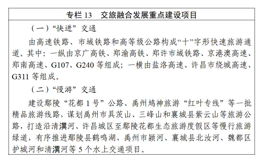 构建便捷高效的“快进”通道。依托京广高铁、郑许市域铁路、京港澳高速、盐洛高速、G311等构建“十”字形快速旅游通道,提高旅游目的地的通达性和便捷性。开通许昌航站楼、高铁站至曹魏古城、神垕古镇等主要景区的旅游专线和旅游直通车,推出连通景区的公交旅游观光线路,推广“交通 门票”等一站式票务服务。