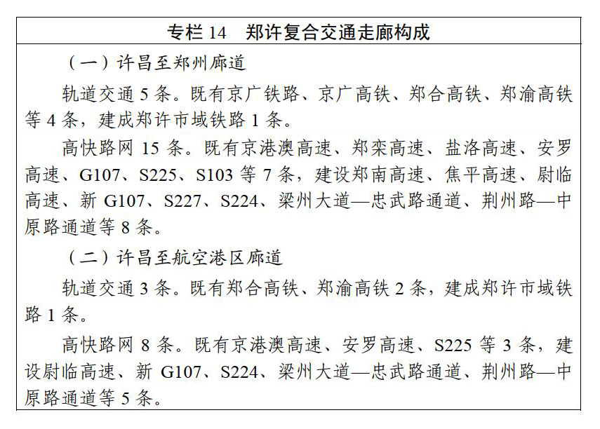 京港澳主轴。国家京津冀-粤港澳主轴和河南省“米”字形通道的重要组成部分,主要由京广高铁、京广铁路、郑许市域铁路、京港澳高速、许广高速、许信高速、G107、G230等线路组成。依托京港澳主轴,向北加强与京津冀城市群交通联系,向南强化与长江中游城市群沟通交流。