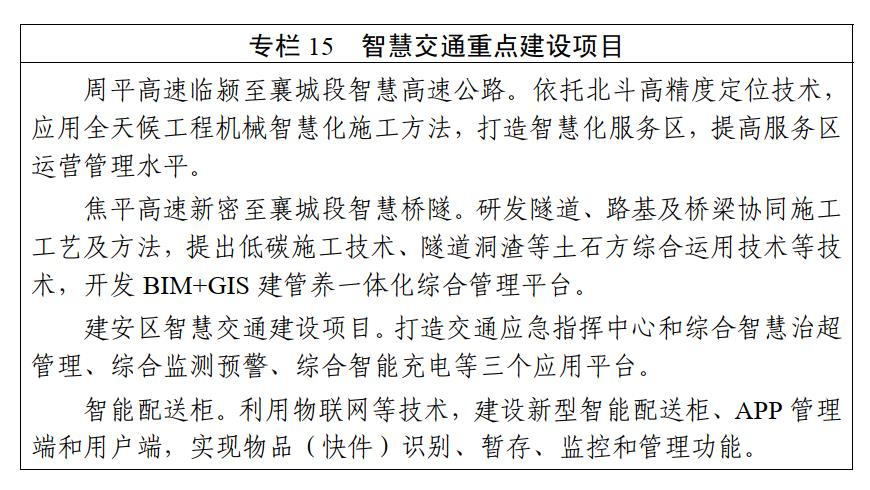 建设新型交通基础设施。强化大数据、互联网、人工智能等新技术与交通行业深度融合,加快推动无人驾驶的郑许市域铁路通车运营,建设周平高速临颍至襄城段智慧高速、焦平高速新密至襄城段智慧桥隧,推进京港澳、许广等高速公路繁忙路段智慧化改造提升,打造许昌公铁联运智慧物流产业园等智慧物流试点。深化高速公路ETC门架应用,在重要通道、区域探索建设路侧基站,推进车路协同等设施建设,丰富车路协同应用场景。完善充电基础设施网络布局,加快推进公路沿线、服务区、客货运站场等充电设施建设,全面提升电动汽车充电基础设施保障能力。