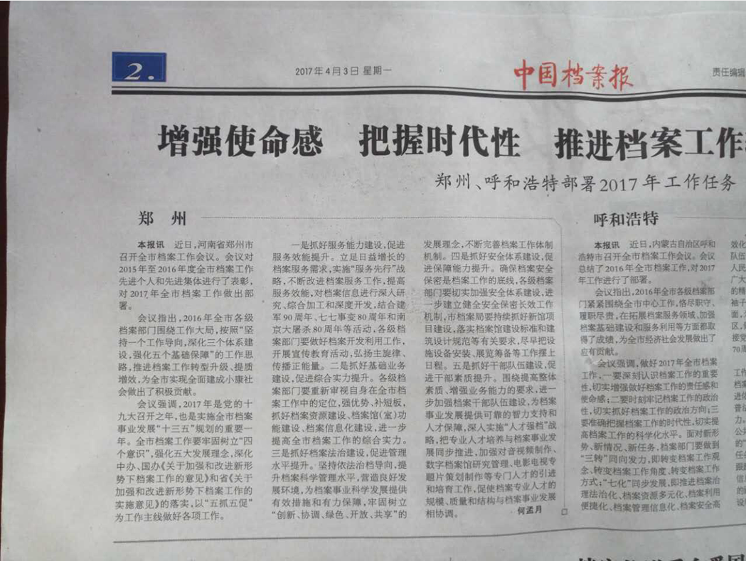 近来,郑州市各级档案部门围绕全市档案工作会精神,树立“四个意识”,强化五大发展理念,深化落实中办、国办《关于加强和改进新形势下档案工作的意见》和省《关于加强和改进新形势下档案工作的实施意见》,以“五抓五促”为工作主线抓布置、抓落实。各县市区档案局纷纷召开年度档案工作会议部署工作,局机关各处室分解责任目标狠抓工作落实。