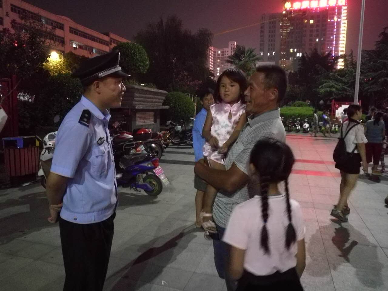 7月31日,中心路派出所盛世社区辅警韩广进、王冰冰在上街区亚星盛世广场参加建军九十周年文艺晚会执勤时,接到一群众求助,并积极帮忙找回一名走失的小女孩。
