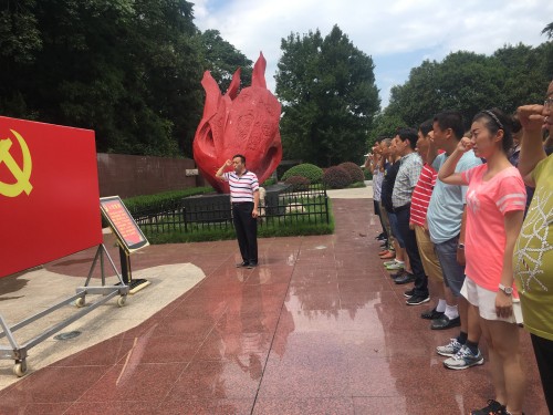 在鄂豫皖苏区首府烈士陵园,培训学员在革命烈士纪念碑前向鄂豫皖苏区牺牲的革命烈士三鞠躬,深刻缅怀先烈们的丰功伟绩。全体党员面向鲜红的党旗,庄严的举起右手重温入党誓词。