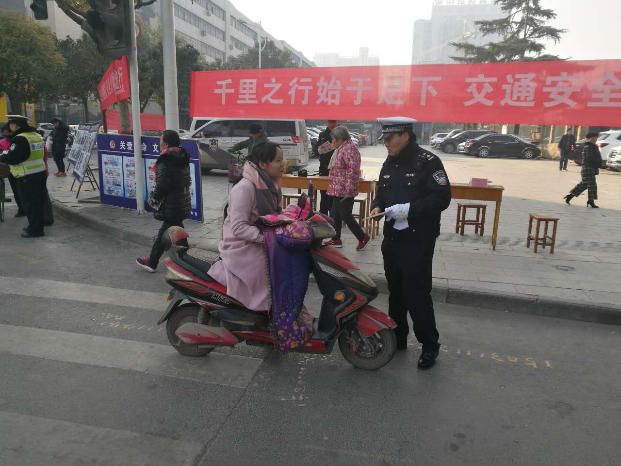 上午9时,大队在亚星盛世广场设立交通安全宣传服务站,包括交通法律法规咨询台、事故处理业务咨询台、车辆管理业务咨询台等,及时解答群众有关交通管理工作的问题。活动期间,大队悬挂“尊法守规明礼,安全文明出行”等主题宣传横幅、摆放宣传展板,印制了交通安全宣传折纸等宣传材料。为增强宣传活动效果,大队利用亚星盛世广场大屏幕、悦达广场电子大屏幕滚动播放交通安全宣传片,取得了良好的果。