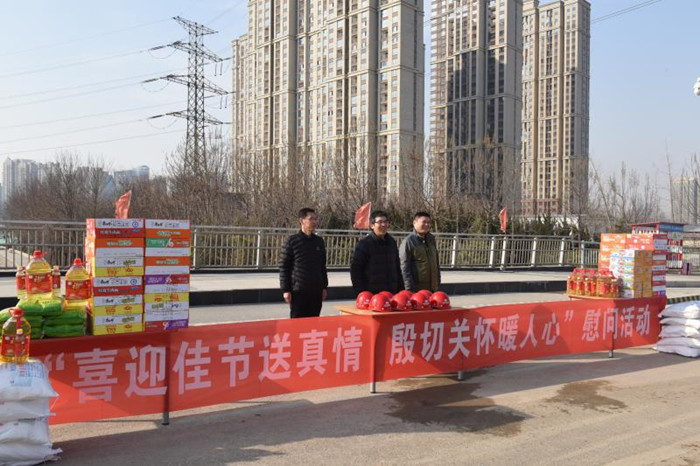 春节将至,岁寒情深,2月7日下午,东三环(107辅道)快速化工程PPP项目部项目经理李锦林带着米、面、油、方便面、火腿肠等慰问品,来到隧道标段施工现场,慰问坚守在一线的施工人员。项目部副经理、工程部部长王柳洋,综合部部长李州琪及项目公司、总承包部主要领导一同参加。