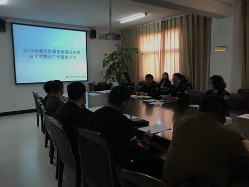 3月13日下午,惠济区食药监局组织辖区中原眼镜城、博金商贸城及11家经营企业召开2018年惠济区隐形眼镜及护理液专项整治暨培训会。