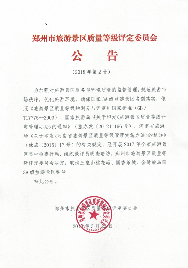 关于三皇山桃花峪、国香茶城、金鹭鸵鸟园取消3A级景区公告 郑州市旅游局 2018-03-23 郑州 ℃ 加入收藏 错误报告 索引号:005252987/2018-00040主题分类:综合政务/公报公示/公告公示发布机构:郑州市旅游局关键词:取消3A级景区公告文号成文日期:2018-03-23发布日期:2018-03-23体裁生效日期废止日期关于三皇山桃花峪、国香茶城、金鹭鸵鸟园取消3A级景区公告 标签: 上一篇:郑州市统计局编印《统计视点》一书 下一篇:返回列表 相关推荐 留言与评论(共有 0 条评论) 验证码: