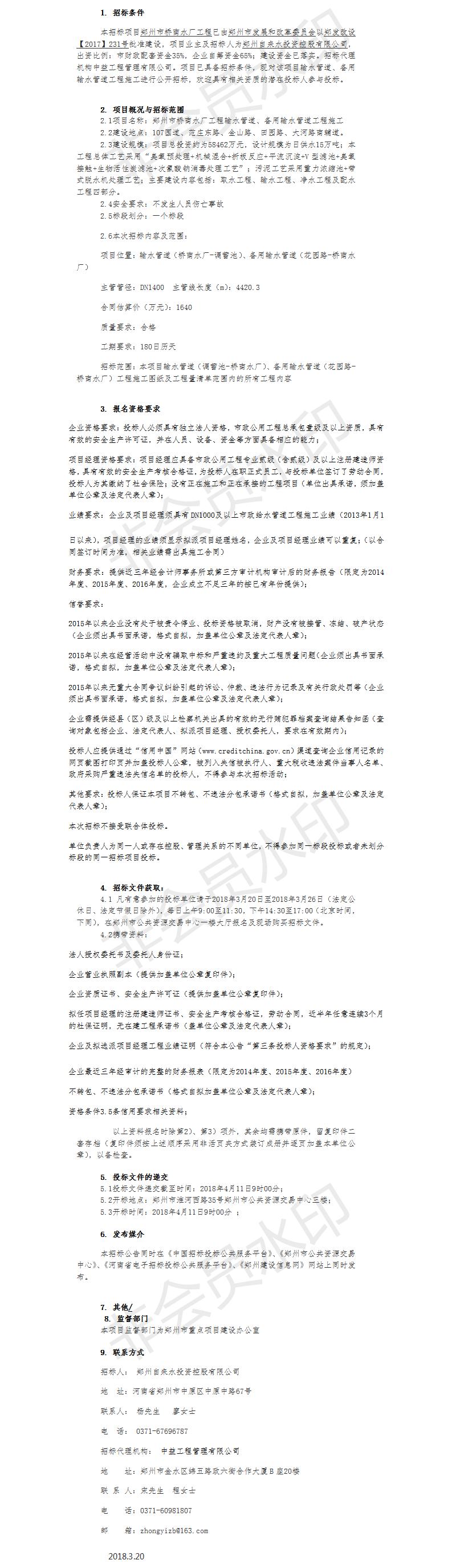 郑州市桥南水厂工程输水管道、备用输水管道工程施工招标投标信息 郑州市发展和改革委员会 2018-04-20 郑州 ℃ 加入收藏 错误报告 索引号:005252100/2018-00791主题分类:国民经济管理、国有资产监督/重大建设项目/项目信息/重大建设项目招标投标信息发布机构:郑州市发展和改革委员会关键词:重大建设项目,招投标文号成文日期:2017-04-21发布日期:2018-04-20体裁生效日期废止日期郑州市桥南水厂工程输水管道、备用输水管道工程施工招标投标信息招标投标违法处罚处罚信息:无 标签: 上一篇:郑州市桥南水厂工程输水管道、备用输水管道工程施工监理招标投标信息 下一篇:返回列表 相关推荐 留言与评论(共有 0 条评论) 验证码: