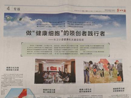 7月11日,郑州日报第4版整版专题报道了市卫计委健康机关建设纪实。自此,由郑州市爱卫办主办、郑州日报承办的健康细胞建设经验交流专题报道正式拉开帷幕。