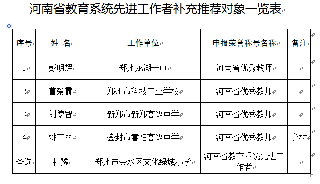 根据《河南省人力资源和社会保障厅、河南省教育厅关于评选表彰河南省教育系统先进集体和先进工作者的通知》(豫人社函〔2018〕377号)要求,按照“公开、平等、竞争、择优”的原则,2018年8月29日,组织评审委员会评议,经研究,拟补充推荐4名优秀教师候选对象、1名备选对象(名单附后)。现予以公示,接受监督。公示时间为2018年8月31日至9月4日,监督电话:66962327。