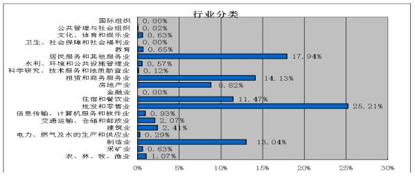 从产业分组的用人需求看,第一、二、三产业的需求人数所占比重分别为1.07%、16.37%和82.56%,第三产业的用人需求最多。从行业分组的用人需求看,用人需求量大的行业有批发和零售业、居民服务和其他服务业、租赁和商务服务业、制造业、住宿和餐饮业等,其用人需求比重分别为25.21%、17.94%、14.13%、13.04%和11.47%。和去年同期数据相比,制造业用人需求比重有所下降,居民服务和其他服务业用人需求比重有所上升。在经济增速放缓的背景下,传统制造业首先受到冲击,用人总量出现下滑,尤其是进入智能时代,传统制造业已经开始转型升级。随着互联网经济的快速发展,各行业的发展模式开始转变,很多传统行业不能够快速适应这种转变,经济效益和用人需求就会受到影响。相反,一些新兴行业和服务行业很快完成转型升级,进入了快速发展模式,用人需求也相应的有所上升。