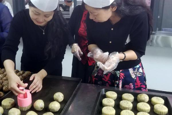 在面点师傅的讲解、指导下,大家分工合作,有的和面,有的压月饼皮,有的团馅,有的压模……当第一个印着花纹的月饼魔术般地出现在烤盘里时,大家都禁不住发出激动欣喜的惊叹。随后,大家信心百倍、兴致勃勃的开始做月饼。伴随着欢声笑语,一个个皮酥馅美的月饼新鲜出炉。朗朗的笑声和刚出炉的月饼散发的香气融合在一起,营造出浓浓的节日气氛。