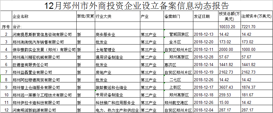 2018年12月,郑州市共设立备案外商投资企业12家(其中河南自贸区郑州片区3家,郑州高新区2家,航空港区1家),投资总额10033.20万美元,与2018年11月相比减少了76%,注册资本7221.7万美元,与2018年11月相比减少了82.7%。2018年1至12月全市共设立外商投资企业83家,投资总额26.89亿美元,注册资本14.87亿美元。