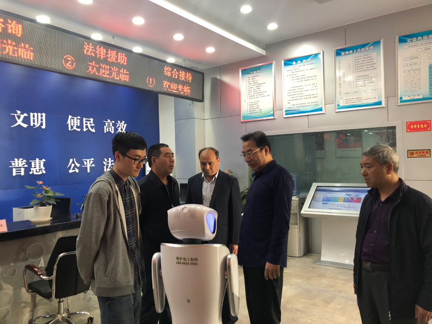 张局长一行实地查看了市公共法律服务大厅、法律援助网络平台和中心办公场所,并与智能法律服务机器人“法务通”进行了互动交流。孙伟强副调研员从工作定位、职能发挥、存在问题和发展思路等几个方面汇报了工作。