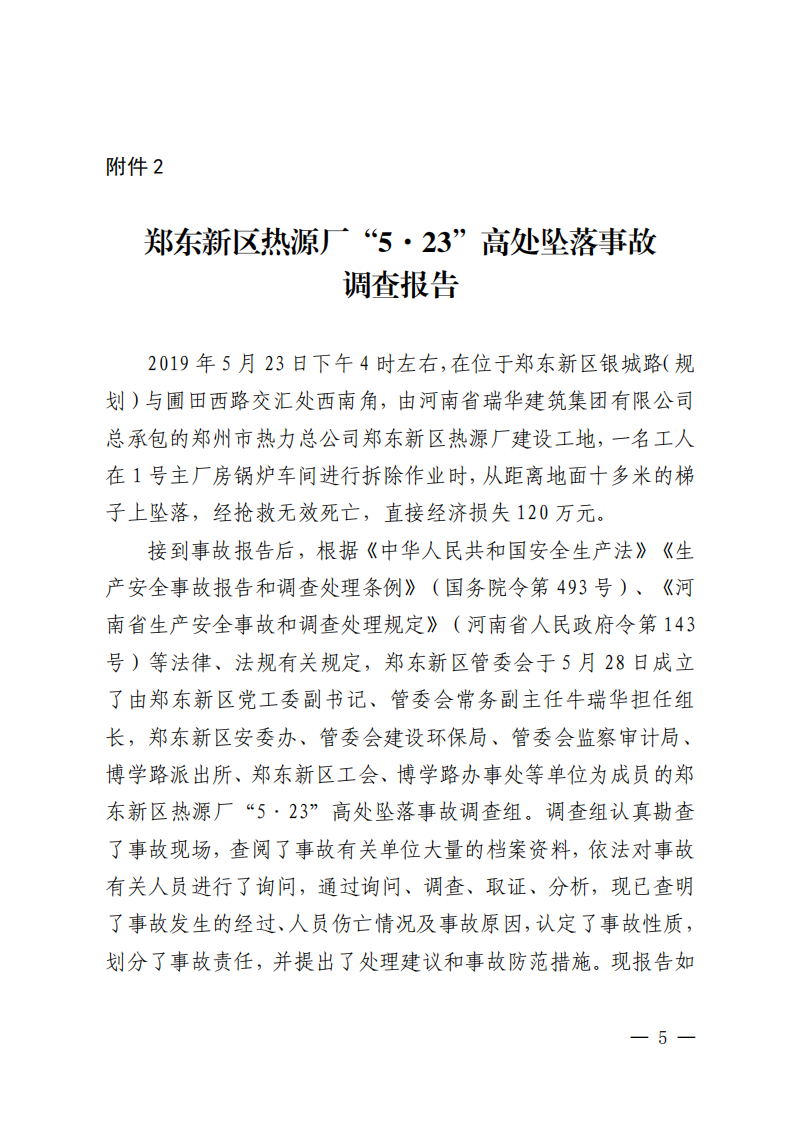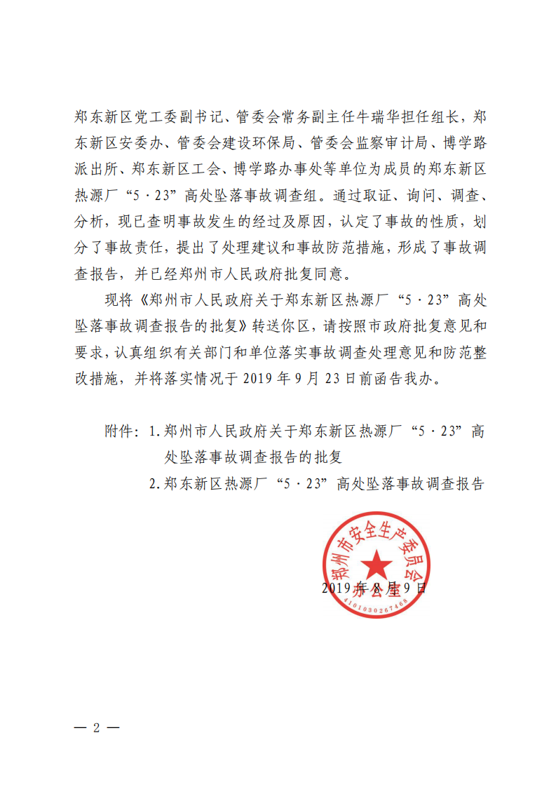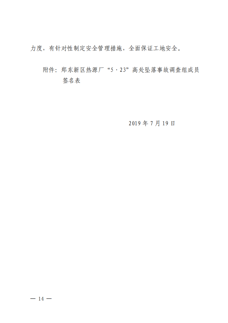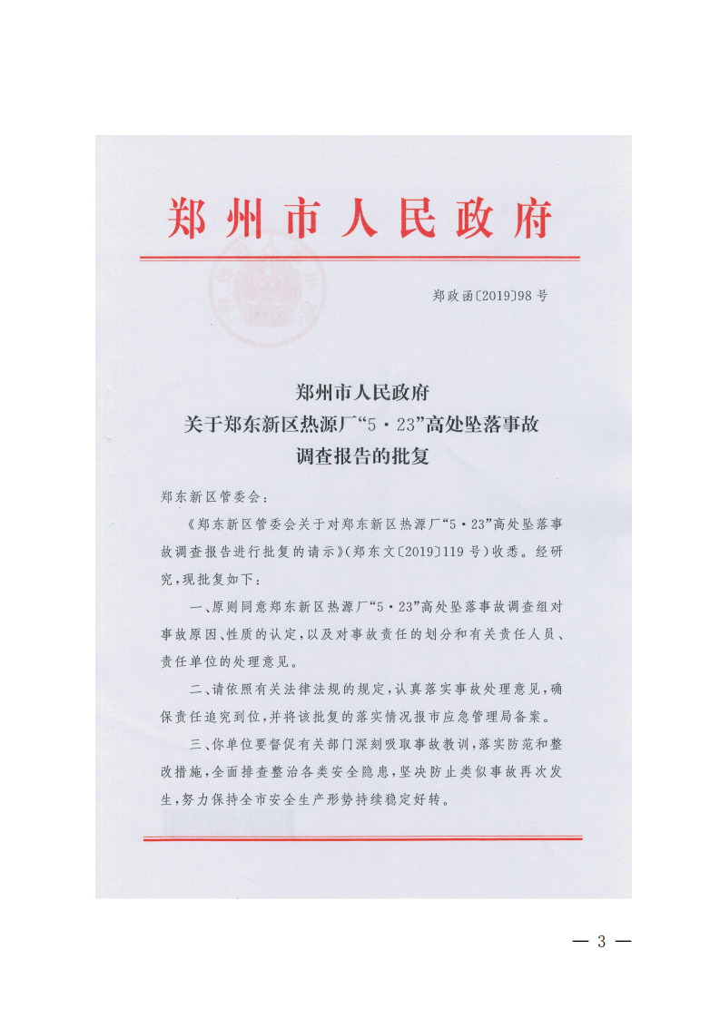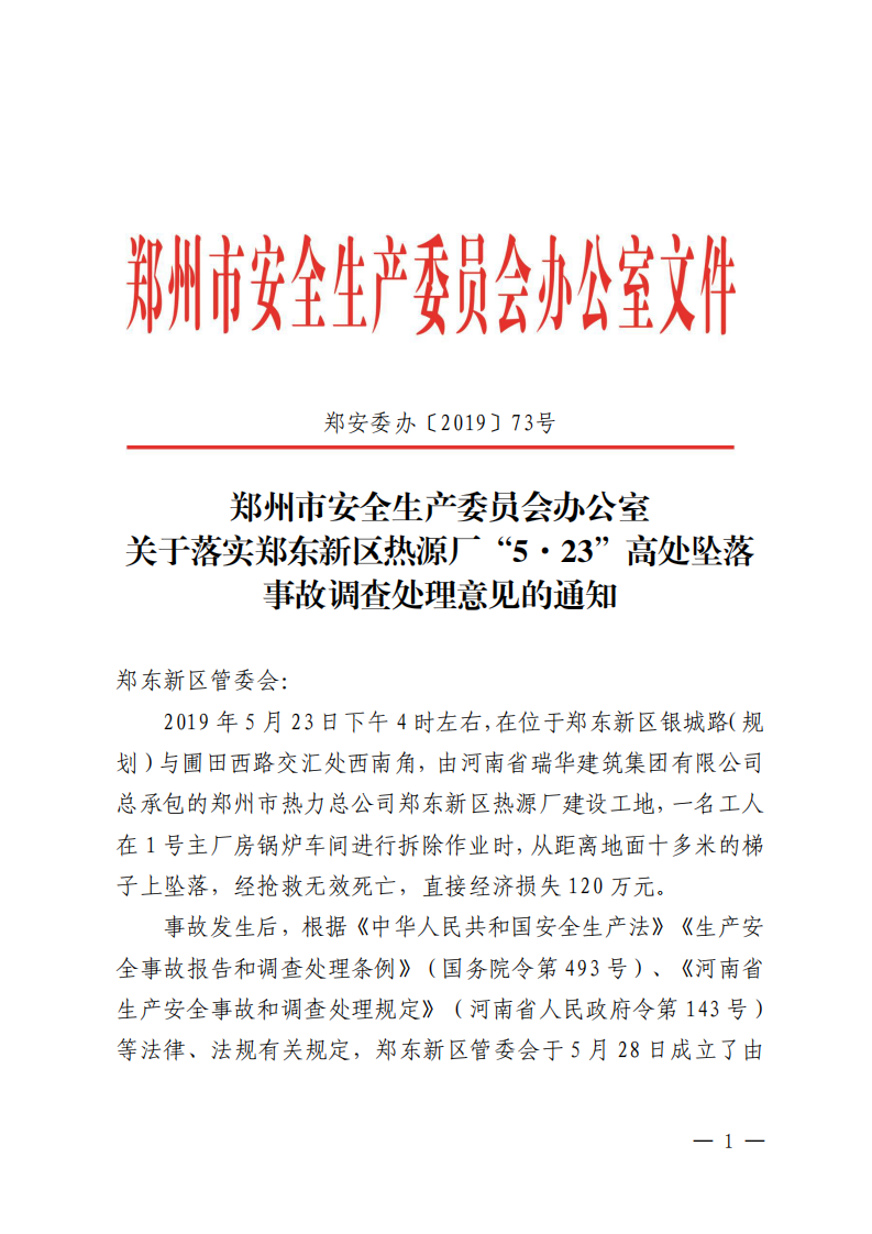 关于落实郑东新区热源厂“5·23”高处坠落事故调查处理意见的通知 郑州市应急管理局 2019-09-01 郑州 ℃ 加入收藏 错误报告 索引号:005252995/2019-00042主题分类:市场监管、安全生产监管/安全生产监管/业务信息/安全生产事故调查报告信息发布机构:郑州市应急管理局关键词:监管,安全文号:郑安委办〔2019〕73号成文日期:2019-08-09发布日期:2019-09-01体裁:通知生效日期废止日期关于落实郑东新区热源厂“5·23”高处坠落事故调查处理意见的通知 标签: 上一篇:关于近期五起事故的通报 下一篇:返回列表 相关推荐 留言与评论(共有 0 条评论) 验证码: