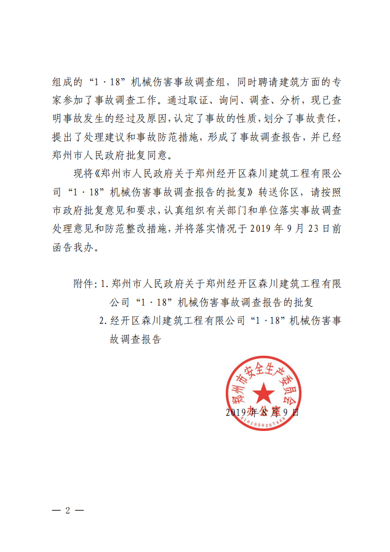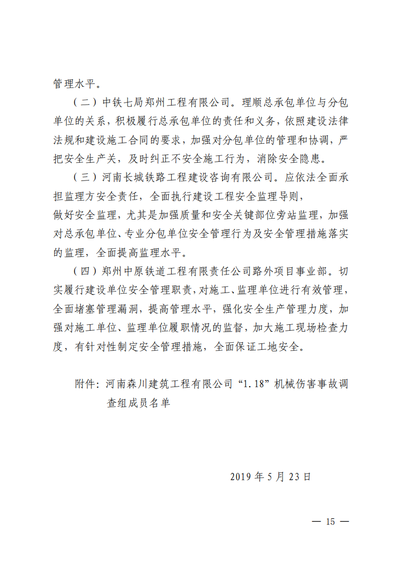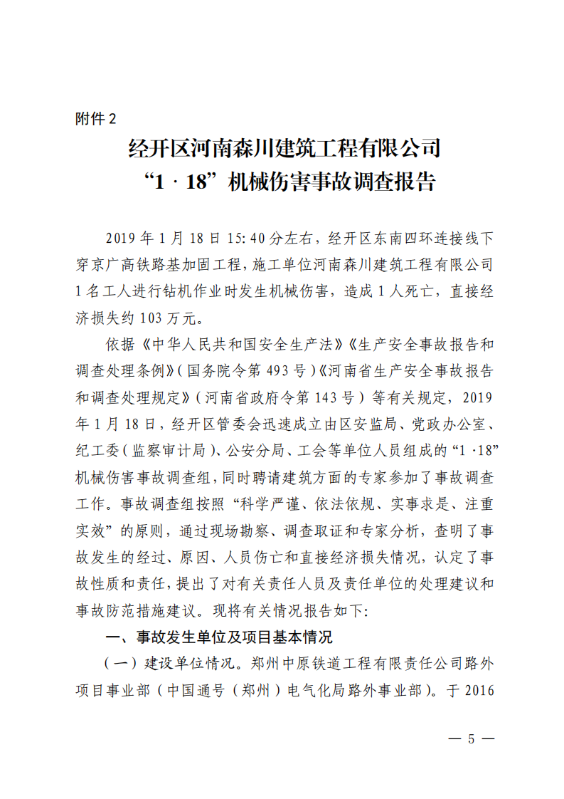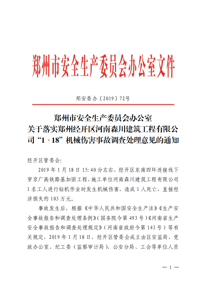 关于落实郑州经开区河南森川建筑工程有限公司“1·18”机械伤害事故调查处理意见的通知 郑州市应急管理局 2019-09-01 郑州 ℃ 加入收藏 错误报告 索引号:005252995/2019-00041主题分类:市场监管、安全生产监管/安全生产监管/业务信息/安全生产事故调查报告信息发布机构:郑州市应急管理局关键词:监管,安全文号:郑安委办〔2019〕72号成文日期:2019-08-09发布日期:2019-09-01体裁:通知生效日期废止日期关于落实郑州经开区河南森川建筑工程有限公司“1·18”机械伤害事故调查处理意见的通知 标签: 上一篇:关于落实郑东新区热源厂“5·23”高处坠落事故调查处理意见的通知 下一篇:返回列表 相关推荐 留言与评论(共有 0 条评论) 验证码:
